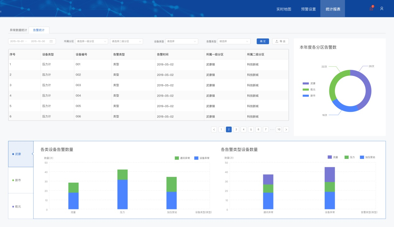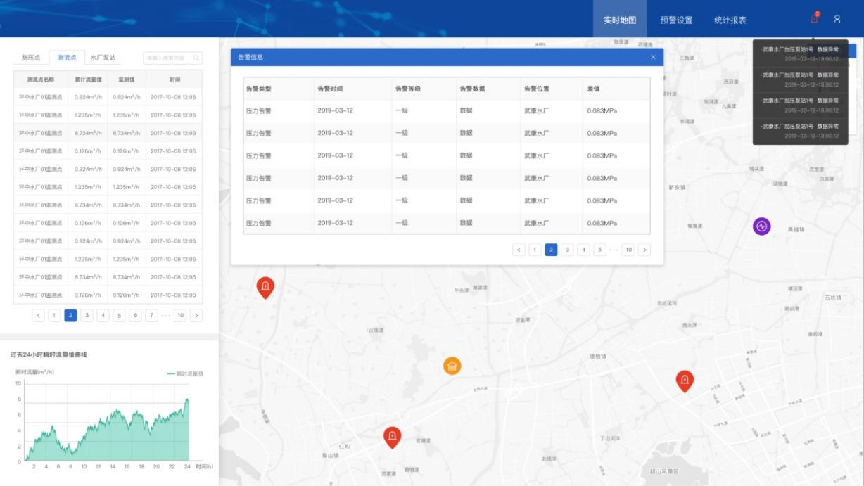 根據(jù)中控采集數(shù)據(jù)如果測壓點低于臨界值,自動發(fā)出報警。