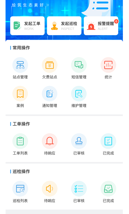 微信小程序主要為用戶提供各種線上服務(wù),涵蓋工單模塊、巡檢模塊、報警模塊、站點管理等功能。