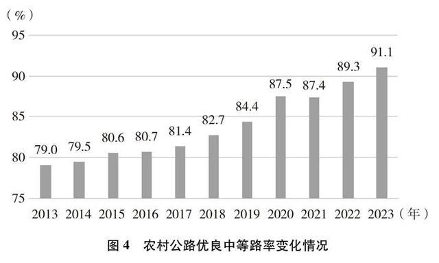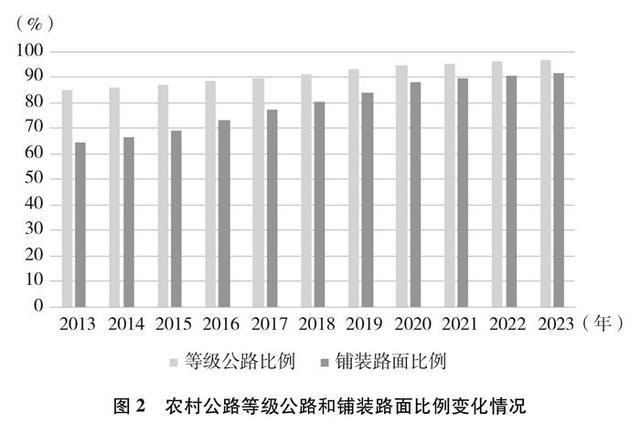 技術(shù)等級逐年提高。截至2023年底,農(nóng)村公路等級路②里程及比例分別達到445萬公里和96.8%,鋪裝路面里程及比例分別達到422萬公里和91.8%,十年間分別提高了11.9個百分點、27.2個百分點。