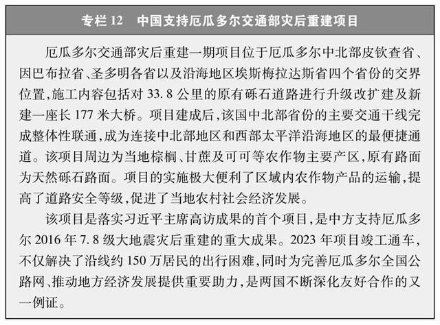 中國積極支持并參與發(fā)展中國家的農(nóng)村公路建設(shè)項目,在其他發(fā)展中國家援建了大批農(nóng)村公路基礎(chǔ)設(shè)施項目,向世界農(nóng)村公路領(lǐng)域分享中國方案、中國經(jīng)驗。通過參與項目建設(shè)、提供技術(shù)支持和人力資源,幫助當?shù)馗纳妻r(nóng)村地區(qū)道路基礎(chǔ)條件(專欄12),極大方便當?shù)厝嗣癯鲂?,大幅度降低物流成本,增強城鄉(xiāng)互動,促進當?shù)剞r(nóng)產(chǎn)品的流通和市場接入,對消減貧困、改善民生、提升人民群眾的生活水平,促進當?shù)亟?jīng)濟社會發(fā)展具有重要意義,深受當?shù)匕傩蘸迷u,如中國無償援建的馬達加斯加首都郊區(qū)公路項目,便利了馬哈扎扎鎮(zhèn)雞蛋運輸,促進了當?shù)氐半u養(yǎng)殖業(yè)發(fā)展,這條路被當?shù)厝擞H切地稱作“雞蛋路”。