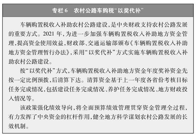 規(guī)范高效用好農(nóng)村公路發(fā)展資金。完善車輛購置稅補助地方資金轉(zhuǎn)移支付制度,利用“以獎代補”方式支持農(nóng)村公路建設(shè)(專欄6),對各級財政用于農(nóng)村公路的資金實施全過程預(yù)算績效管理,提高農(nóng)村公路資金使用效益,加強農(nóng)村公路資金使用監(jiān)管,給資金戴上“緊箍咒”。在資金管理和使用上建立“誰申報誰負責(zé)”“誰使用誰負責(zé)”的責(zé)任機制,確保資金實際足額撥付到位,并按有關(guān)規(guī)定向社會公開,接受群眾監(jiān)督。加強農(nóng)村公路債務(wù)風(fēng)險防控,依法合規(guī)籌措債務(wù)資金。