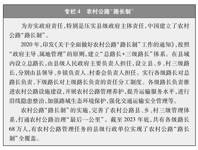 完善政策制度。出臺《關(guān)于推動“四好農(nóng)村路”高質(zhì)量發(fā)展的指導(dǎo)意見》等20余項政策文件,建立覆蓋體制、機制、組織、監(jiān)管、資金、考核、服務(wù)等領(lǐng)域的農(nóng)村公路政策制度體系。把責(zé)任制作為管理的重中之重,出臺《關(guān)于深化農(nóng)村公路管理養(yǎng)護體制改革的意見》,確立省、市級政府加強統(tǒng)籌和指導(dǎo)監(jiān)督、縣級政府履行主體責(zé)任,建立縣級相關(guān)部門、鄉(xiāng)級政府農(nóng)村公路管理養(yǎng)護權(quán)力和責(zé)任清單,形成上下聯(lián)動、密切配合、齊抓共管的工作局面。建立農(nóng)村公路“路長制”(專欄4),由縣、鄉(xiāng)兩級行政負責(zé)人和村(居)委員會負責(zé)人擔(dān)任路長,實現(xiàn)跨部門協(xié)同,推動政府主體責(zé)任高效落實,使農(nóng)村公路管理逐步從粗放向精準、從被動向主動、從單打獨斗向齊心協(xié)力轉(zhuǎn)變。
